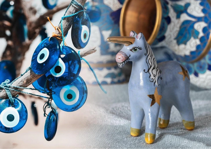 Оберег в виде стилизованного глаза с голубой радужкой — самый узнаваемый талисман в мире. Его корни уходят в древние цивилизации Ближнего Востока, Греции и Египта. Идея проста: он отражает дурной взгляд назад к тому, кто его послал. Его изготавливают из стекла, серебра или золота, придавая ему форму, которая «ловит» и нейтрализует зависть или недоброе пожелание.