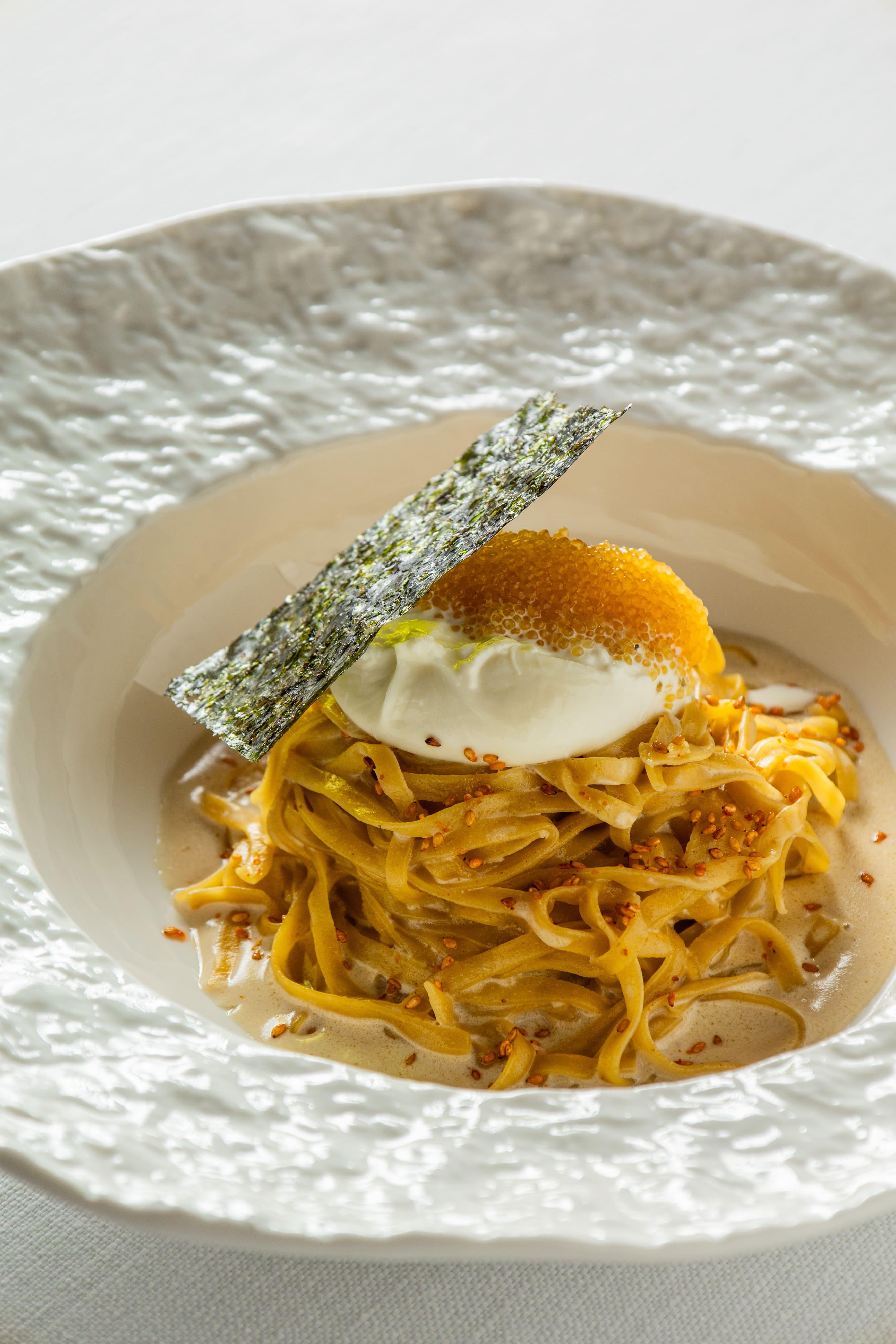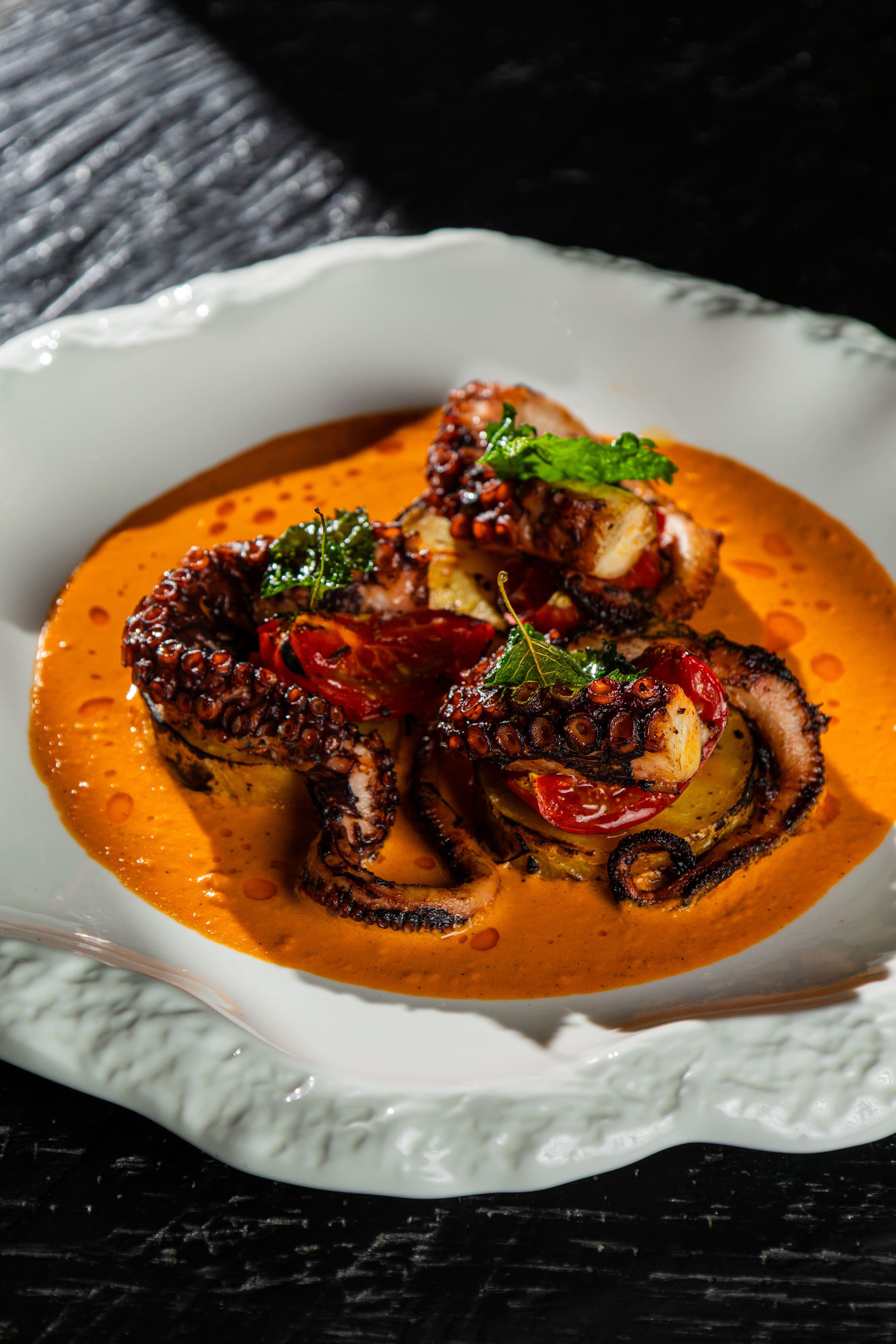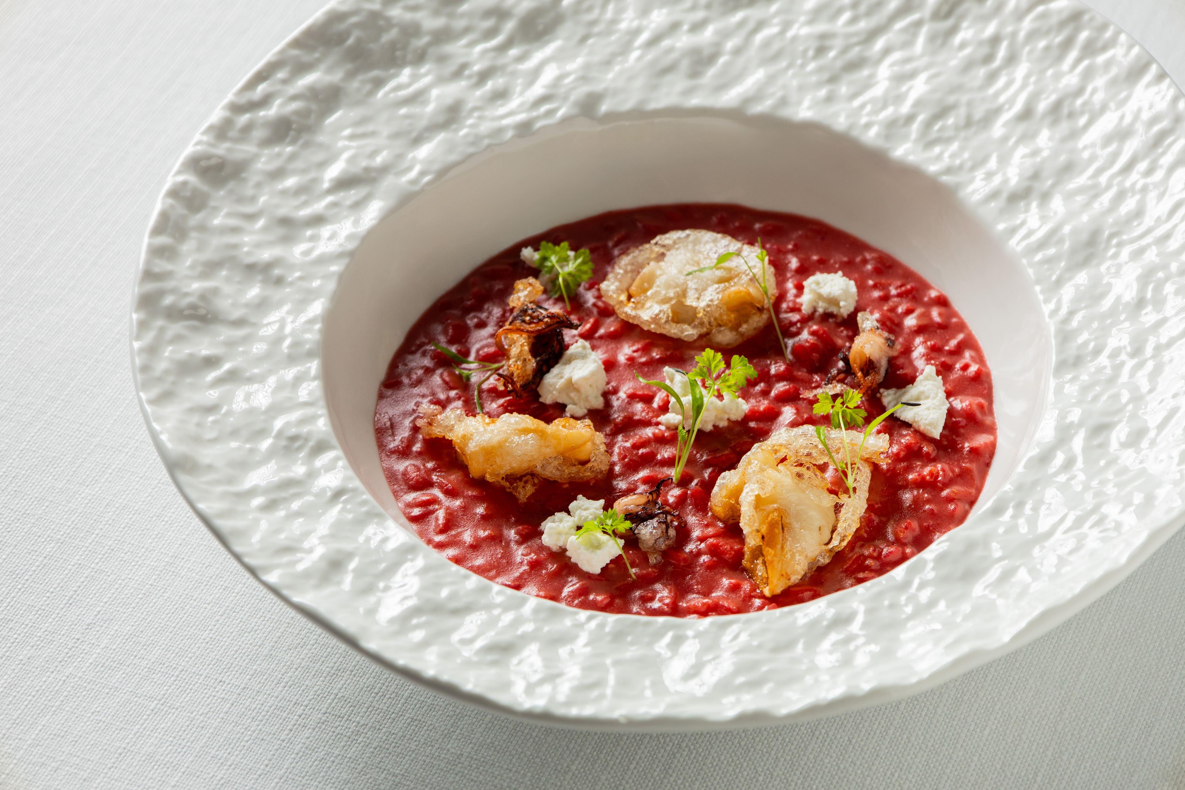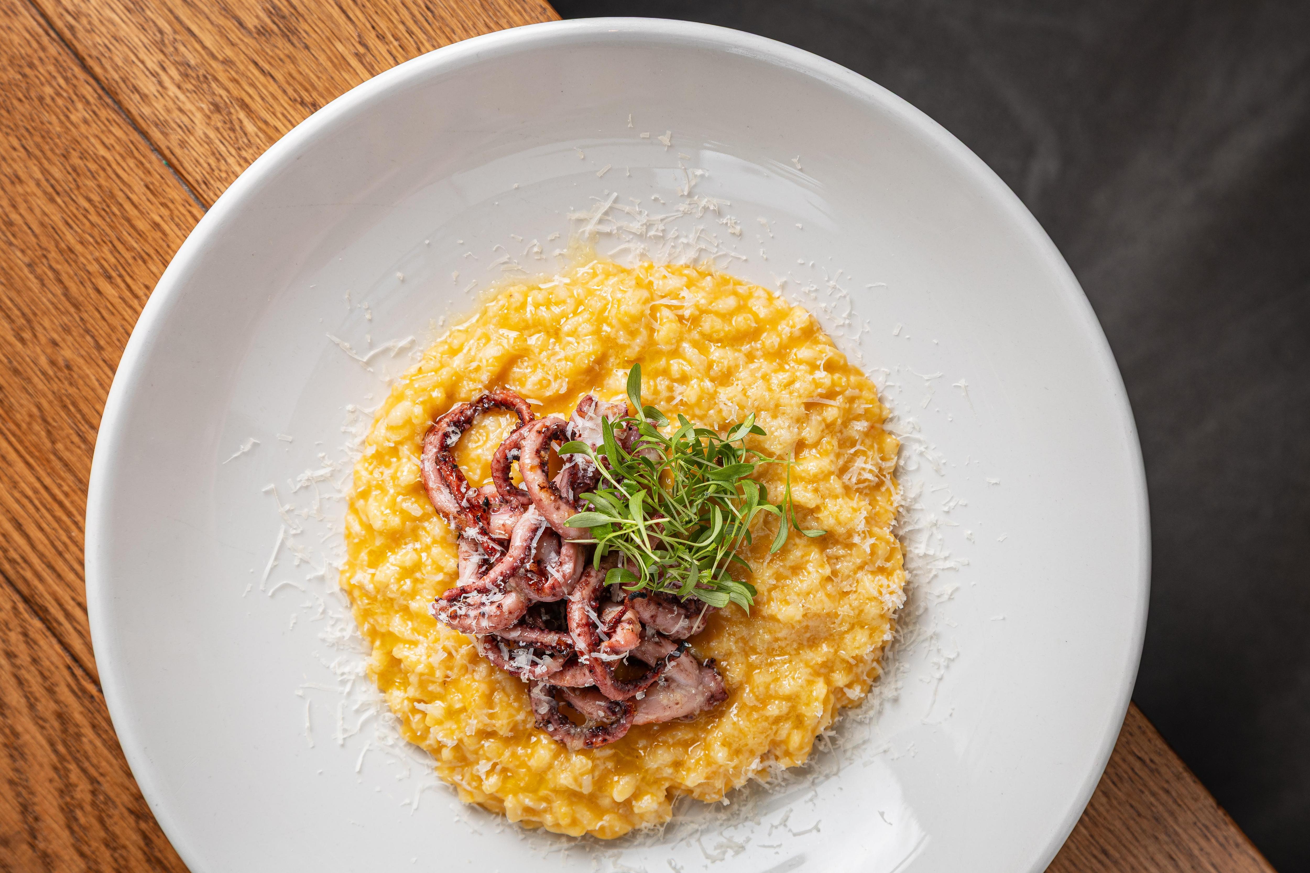 В разделе горячих блюд царствуют жар гриля и жар печи. Филе сибаса с корочкой том ям и дорадо с фисташковым соусом демонстрируют гармонию контрастов. Не остаются в стороне и пасты: например, спагетти с осьминогом и мидиями в соусе карри приобретают индийские нотки, а лингвини со страчателлой получают глубину благодаря копченому соевому соусу. Текстурное разнообразие подчеркивается в ризотто из свеклы с кальмарами в хрустящем кляре.