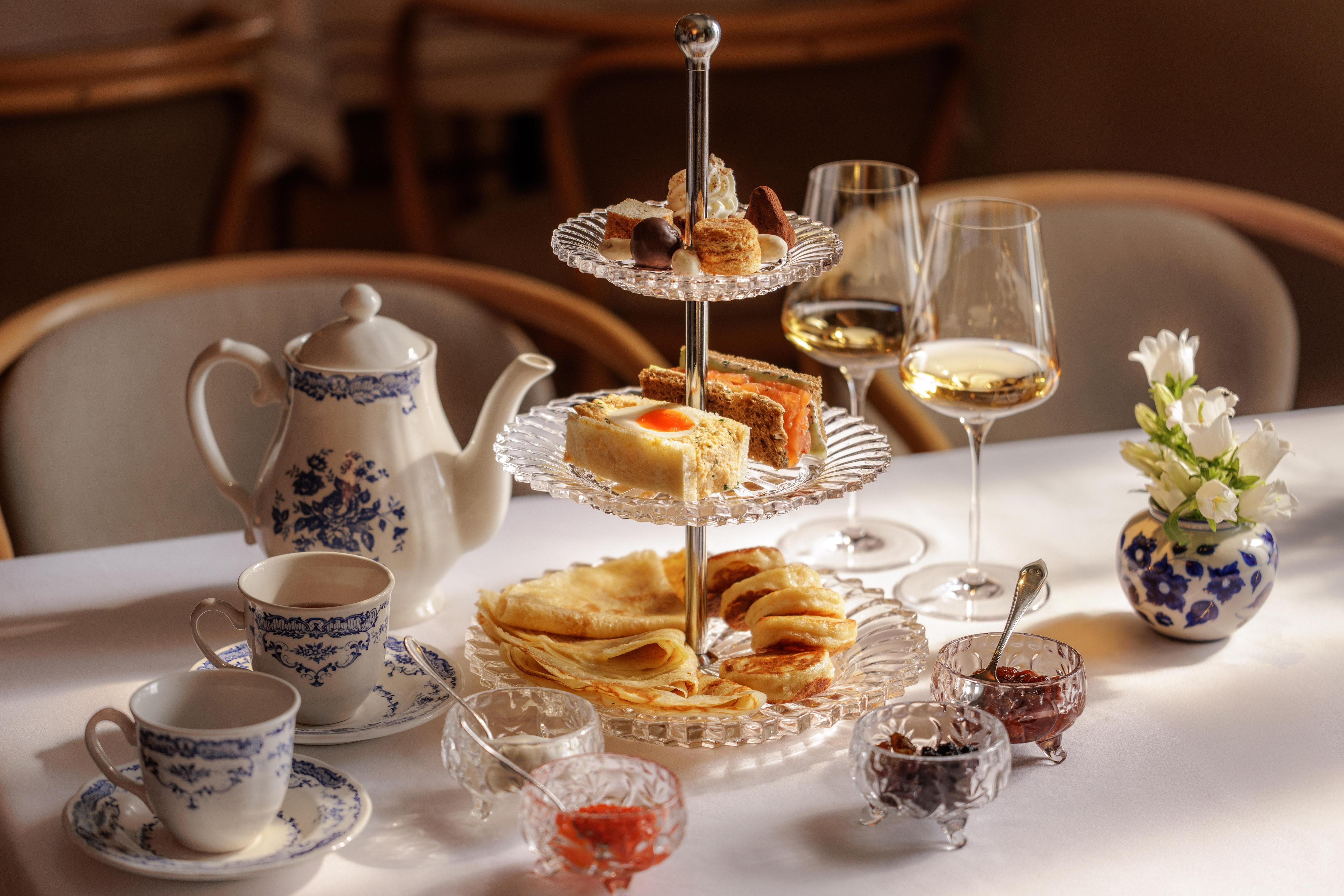 Гостей ждут тонкие блины с икрой нерки, сэндвичи с лососем, миндаль в белом шоколаде и яблочная пастила. Морковный пирог и ягодные топпинги дополнят картину, а к угощениям предложат фирменный чайный купаж или игристое вино. Особый шарм вечеру придаст посещение выставки «Образ Москвы» — каждый заказ чайного сета включает два билета на экспозицию.