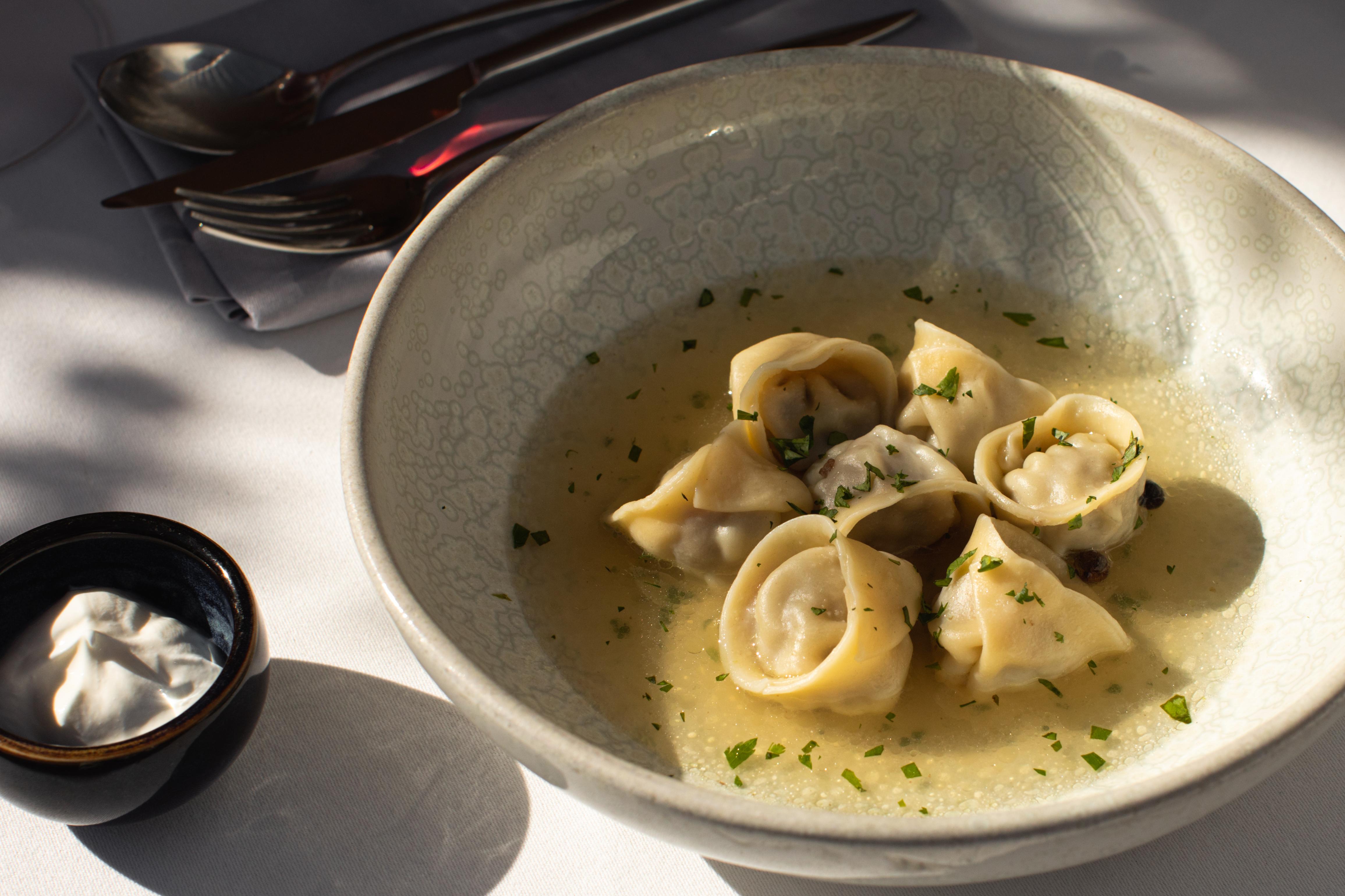 Горячие блюда продолжают развивать осеннюю тему. Гусь конфи с белыми грибами и грушей соседствует в меню с равиоли из козленка с ароматными травами. Для ценителей северных мотивов — пельмени из оленины с ягодным соусом и томленая ягнятина с яблоком. Даже классическая шурпа преображается: наваристый бульон с копченой сметаной и острым маслом раскрывает новые грани знакомого вкуса.