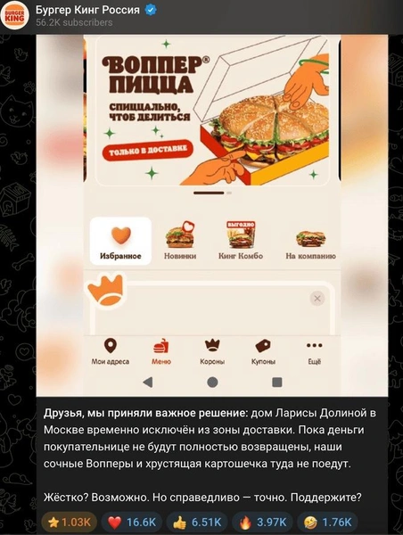 Следом удивил Burger King. В комментарии «Коммерсант FM» компания подтвердила, что исключила дом певицы в Хамовниках из зоны доставки до решения вопроса о деньгах.