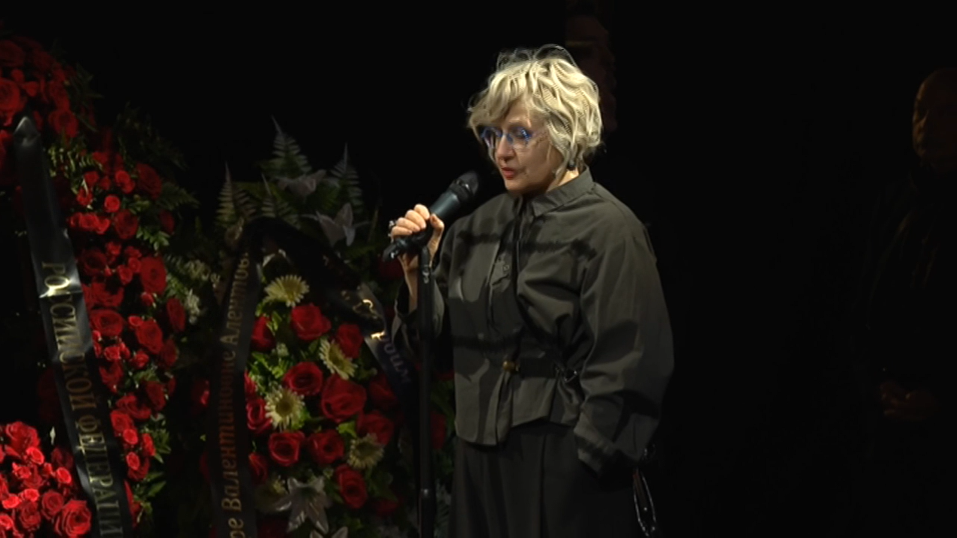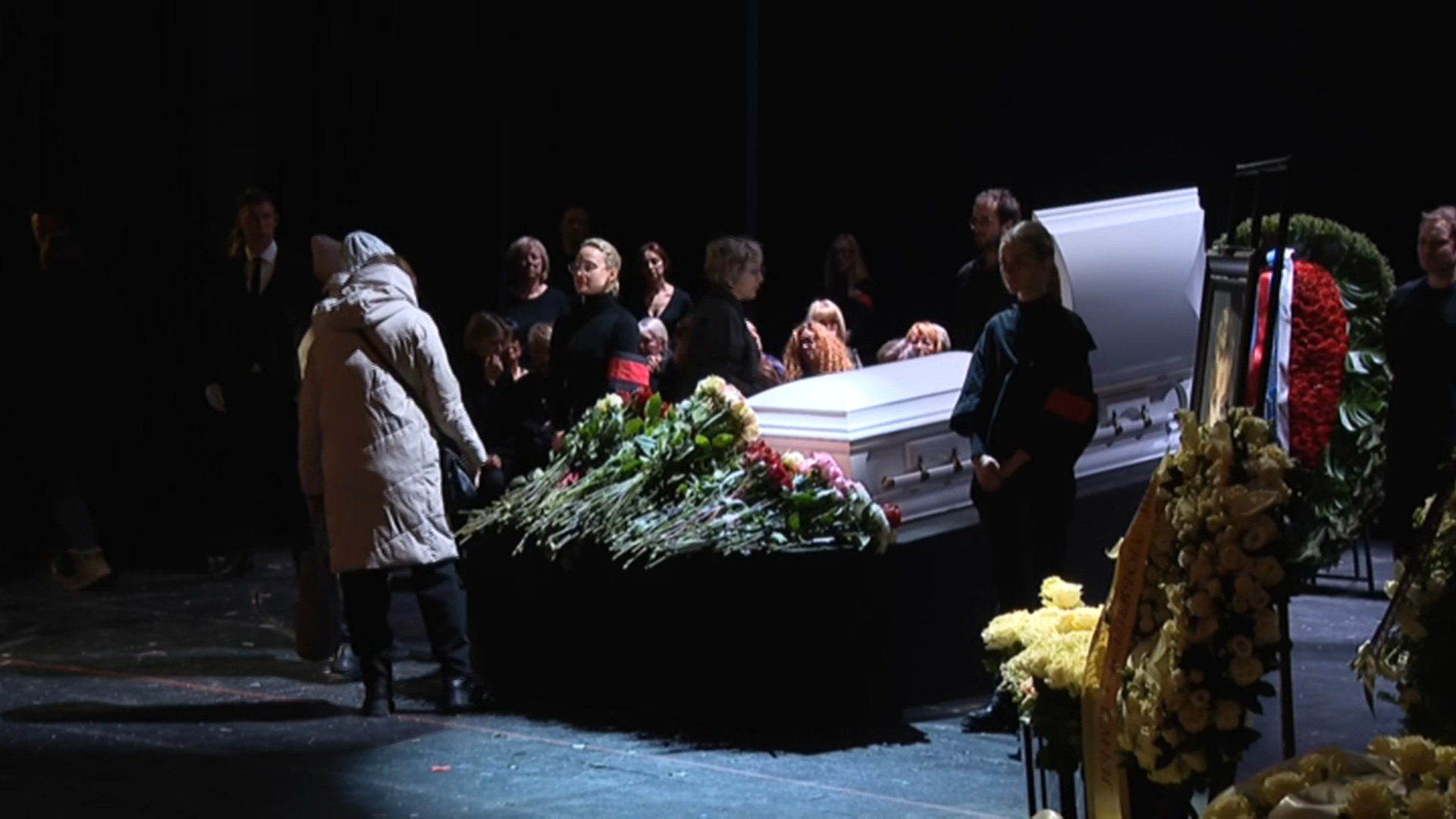Двери театра открылись для прощания в 10:00, однако уже к 9:30 у входа начали появляться первые цветы и траурные венки. В фойе и зале звучала тихая классическая музыка, создавая атмосферу торжественной скорби.