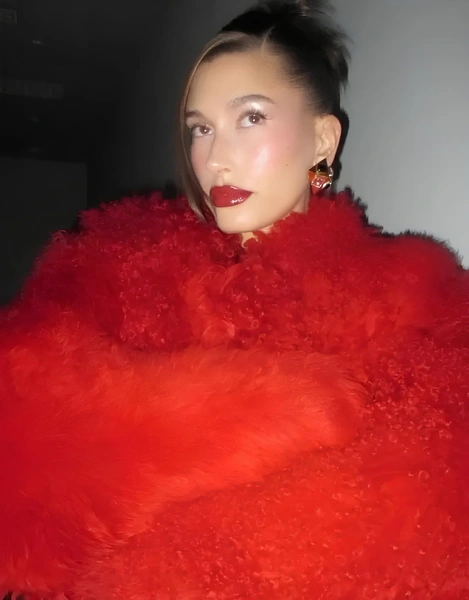 Отдельного внимания заслуживают губы: в новогодних образах Бибер превращает их в главный акцент. В случае с образом в красной палитре можно смело вдохновляться: Красной Огненной Лошади понравится такой в меру яркий и красивый мейкап.