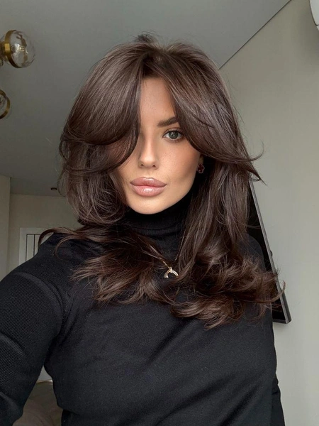 Форма хороша для средних и длинных волос и часто входит в подборки модные стрижки 2026 женские на средние волосы. Волосы выглядят ухоженными даже без укладки, а лицо становится более мягким и свежим.