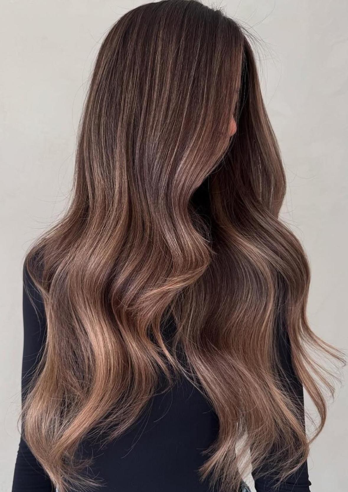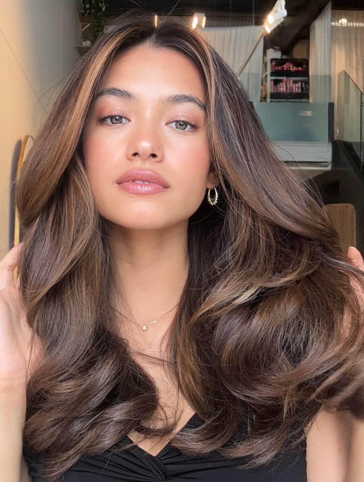 Гладкие прямые пряди делают шоколадные оттенки максимально насыщенными — получается эффект зеркального блеска. Вьющиеся или волнистые волосы дают мягкие переливы, игра света становится заметнее, а объем увеличивается естественным образом.