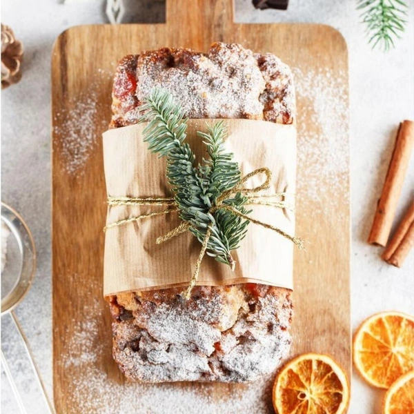 Настоящий штоллен всегда щедро посыпан сахарной пудрой, и чтобы она не осыпалась, кекс лучше завернуть в бумагу и положить в коробку. Интересный и вкусный подарок мужчине на Новый год.