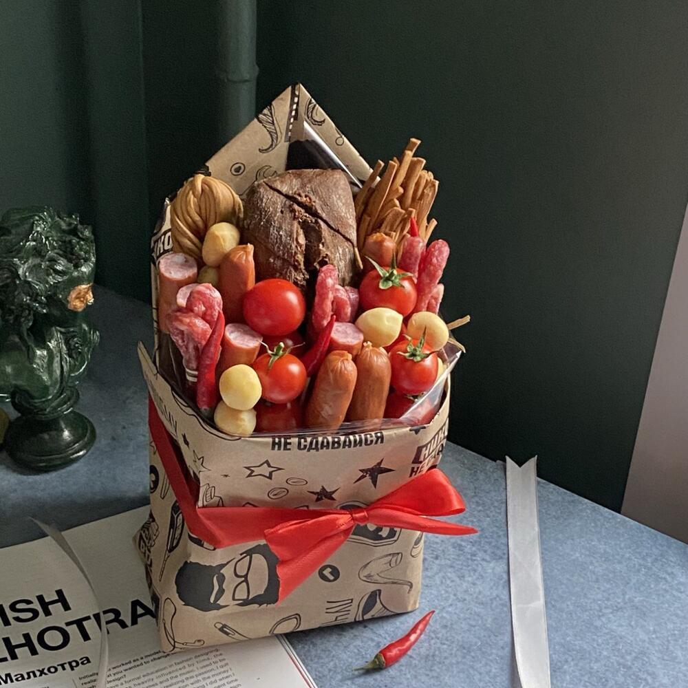 Букеты традиционно ассоциируются с цветами, но что, если заменить их на сыры, вяленое мясо и колбаски? Такая съедобная композиция — оригинальная альтернатива для подарка мужчине, который ценит практичность и вкус. Композицию можно собрать самостоятельно или заказать по своему списку у повара. Главное — учитывать любимые продукты адресата, ведь букет может быть даже из сладостей.