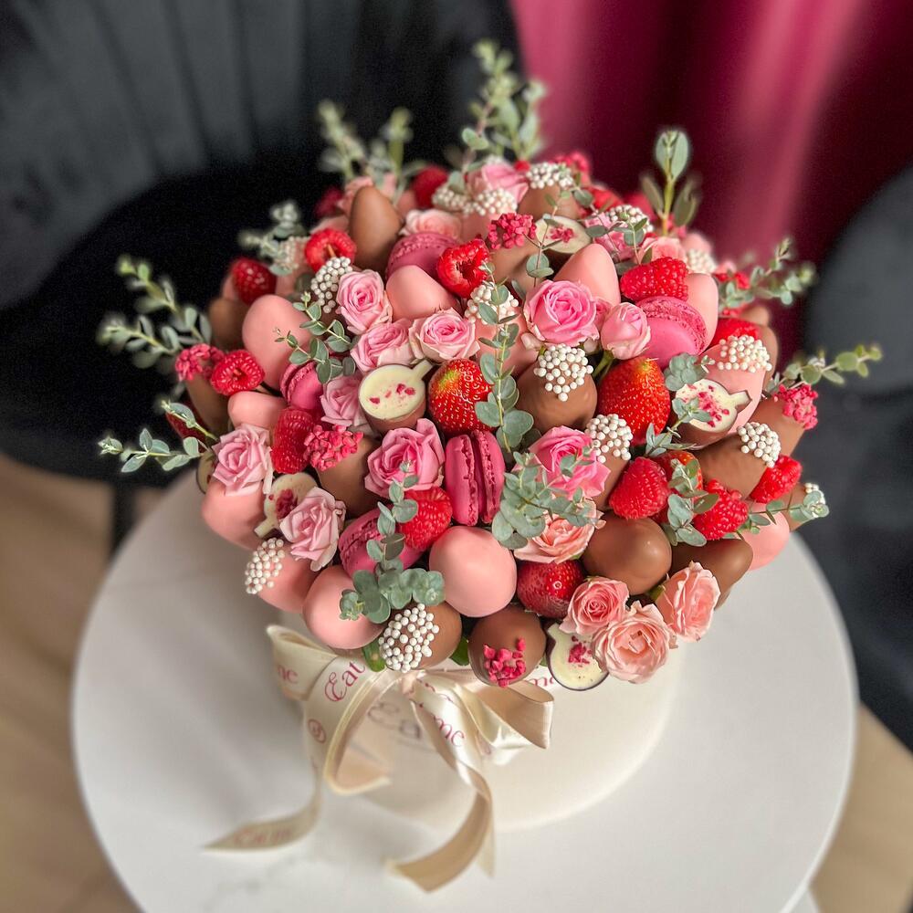 Создать праздничное настроение можно необычным букетом, например, из сладкой клубники, покрытой глазурью. На романтическом ужине такая композиция станет главным украшением стола, а после — вкусным угощением. Если хочется, чтобы съедобный букет выглядел более элегантно, можно попросить флориста украсить ягоды цветами или веточками сухоцветов.