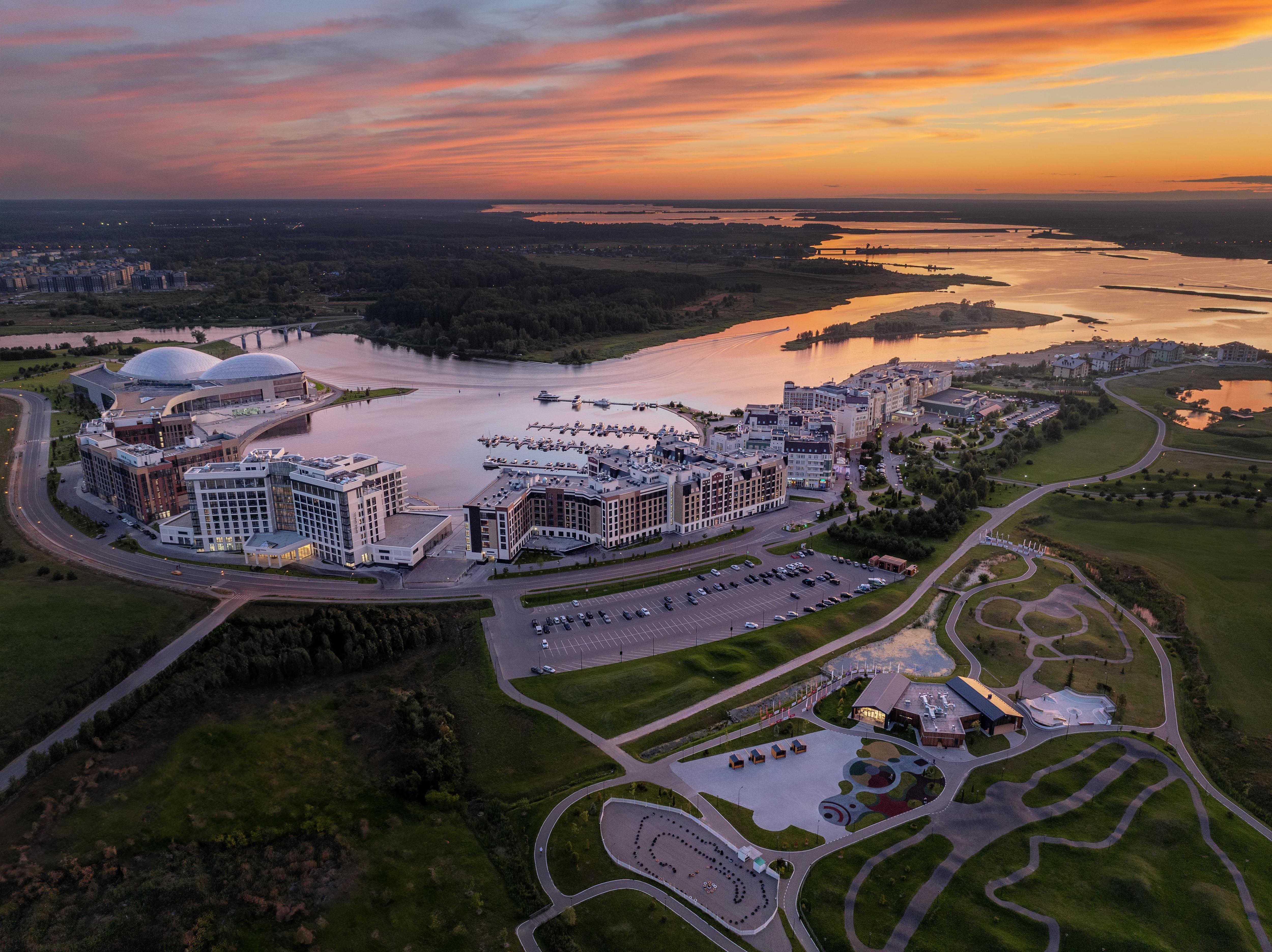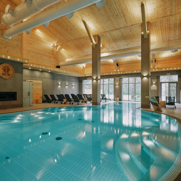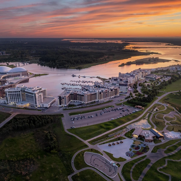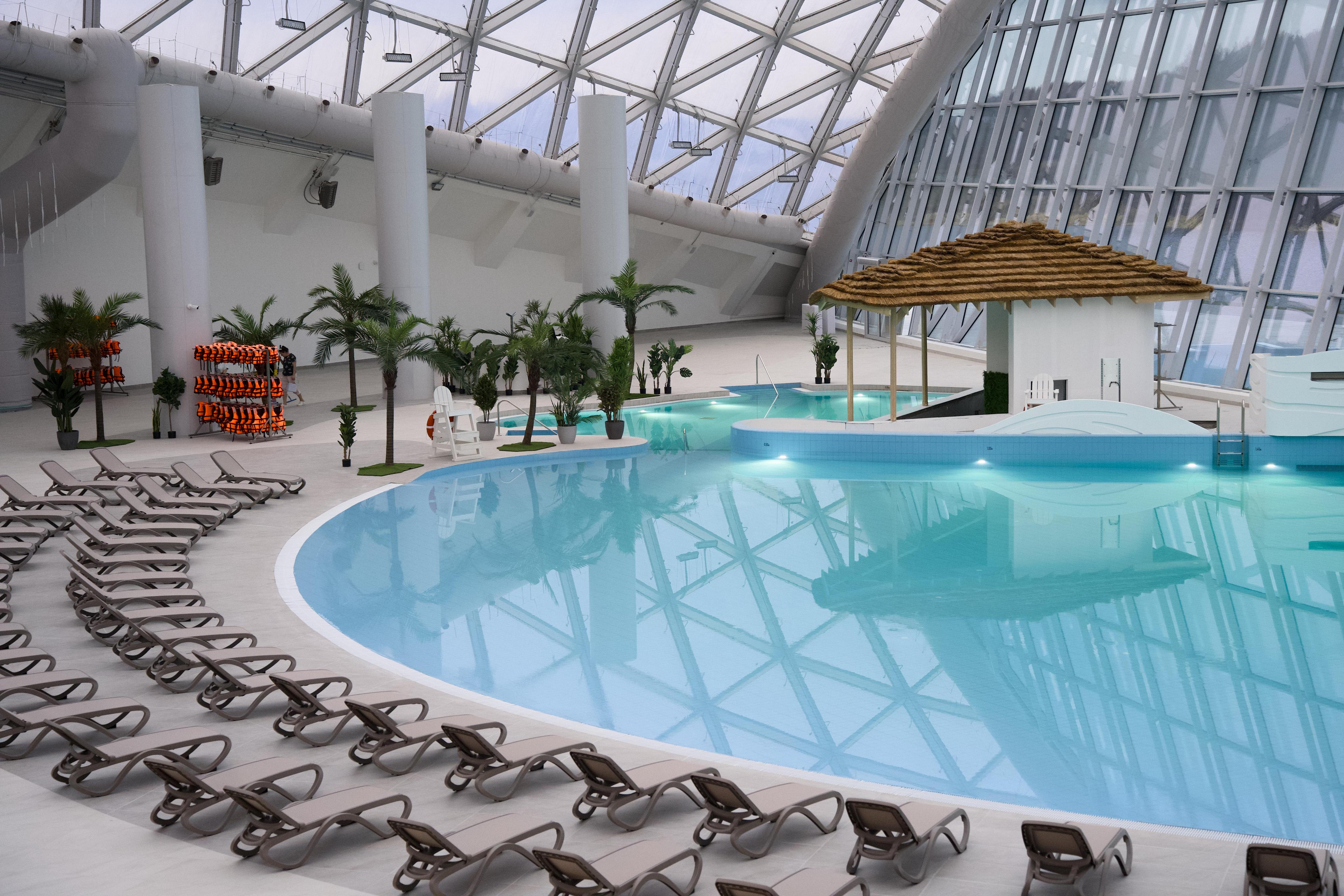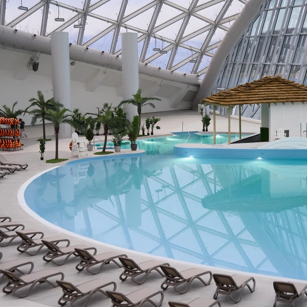 Под огромными светопрозрачными куполами аквапарка, пропускающими солнечные лучи, царит летняя атмосфера независимо от сезона за окном. Пространство разделено на две концептуальные зоны: для ярких впечатлений и для спокойного отдыха. Первая порадует уникальными водными аттракционами и горками, вторая предложит расслабиться в бассейне с эффектом бесконечности или в приватной вилле с собственной купелью. Особой гордостью комплекса является «медленная река», работающая даже в двадцатиградусный мороз.
