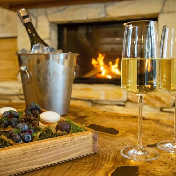 Сразу после заселения в номер или шале гостей ожидает романтический сюрприз: украшение из лепестков цветов, бутылка охлажденного игристого и фирменный десерт. Панорамные виды на Катунь и горы создают идеальный фон для отдыха вдвонм.