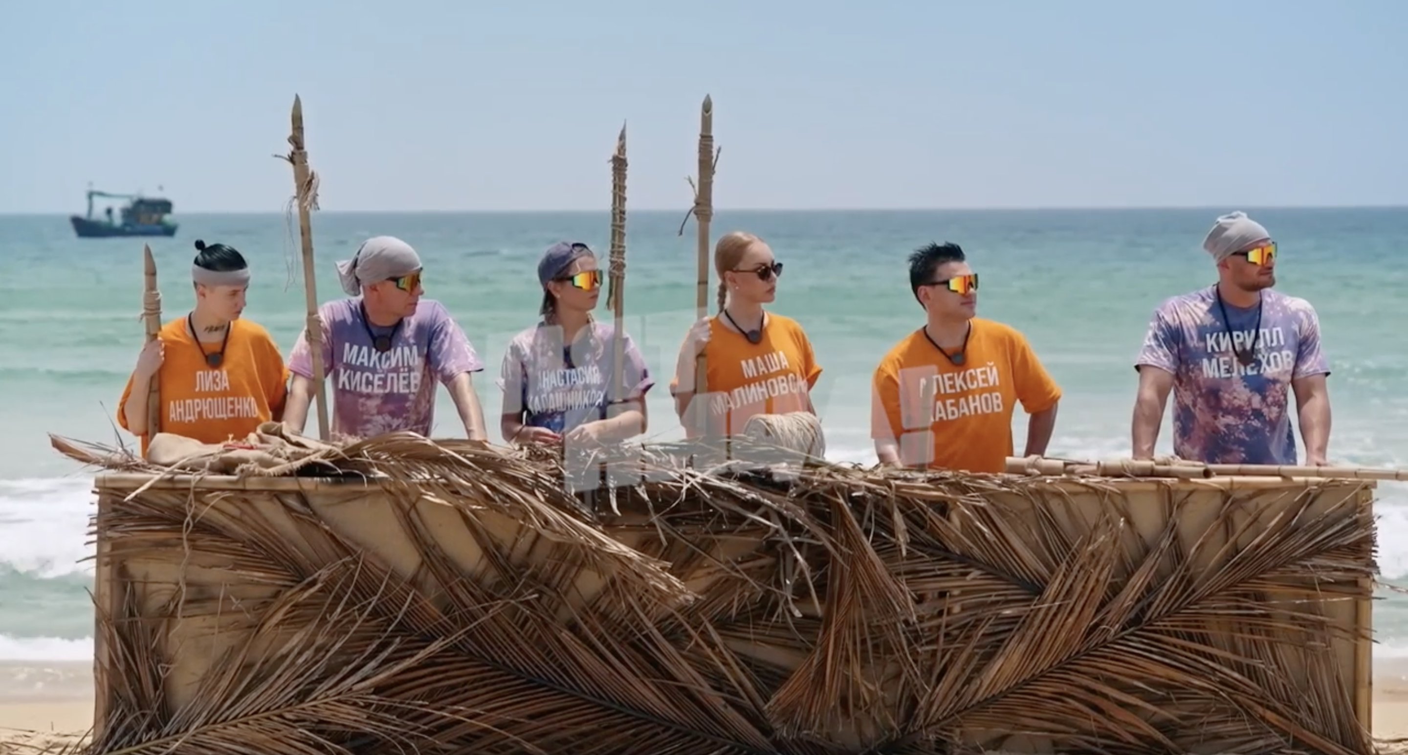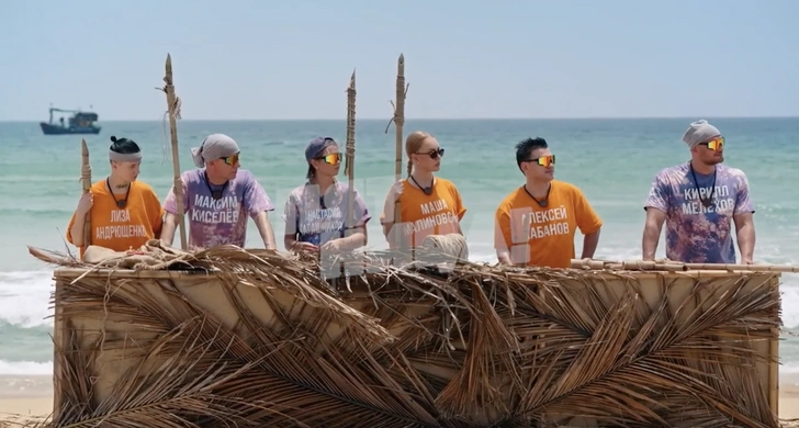 На берегу моря участников ждала огромная мишень. Нужно было поразить ее самодельным копьем, которое предстояло сконструировать за 15 минут из подручных средств. Ближайший к центру бросок приносил подсказку. Максим Киселев снова проявил инициативу, помогая всем с изготовлением оружия.