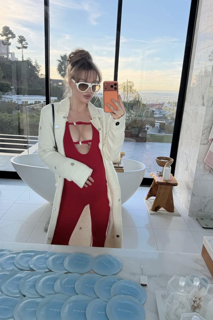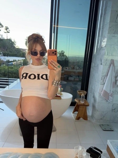 Отдельного внимания заслуживают беременные аутфиты знаменитости. Саша Белякова на последних неделях беременности в белом кроп-топе от бренда Dior и черных леггинсах. Солнцезащитные очки, кольца, браслеты, открытый живот — и мраморная ванная комната за стеклом на фоне холмов Лос-Анджелеса. Беременность в ее исполнении выглядела как отдельный модный проект — Саша здесь смело может конкурировать с Рианной и ее беременными ансамблями.