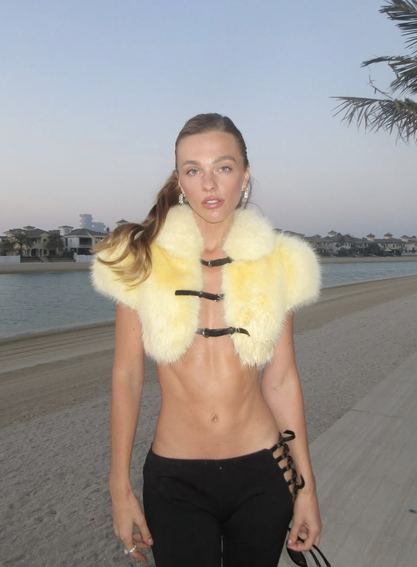 Еще один пример нестандартных и довольно откровенных сочетаний — аутфит Саши в кремово-желтом меховом болеро на застежках, открывающем живот, и черных брюках с завязками на бедре. Хрустальные серьги, убранные волосы, нейтральный взгляд прямо в камеру. Стиль Александры Беляковой — всегда контраст: открытость плюс что-то нарочито неожиданное сверху.