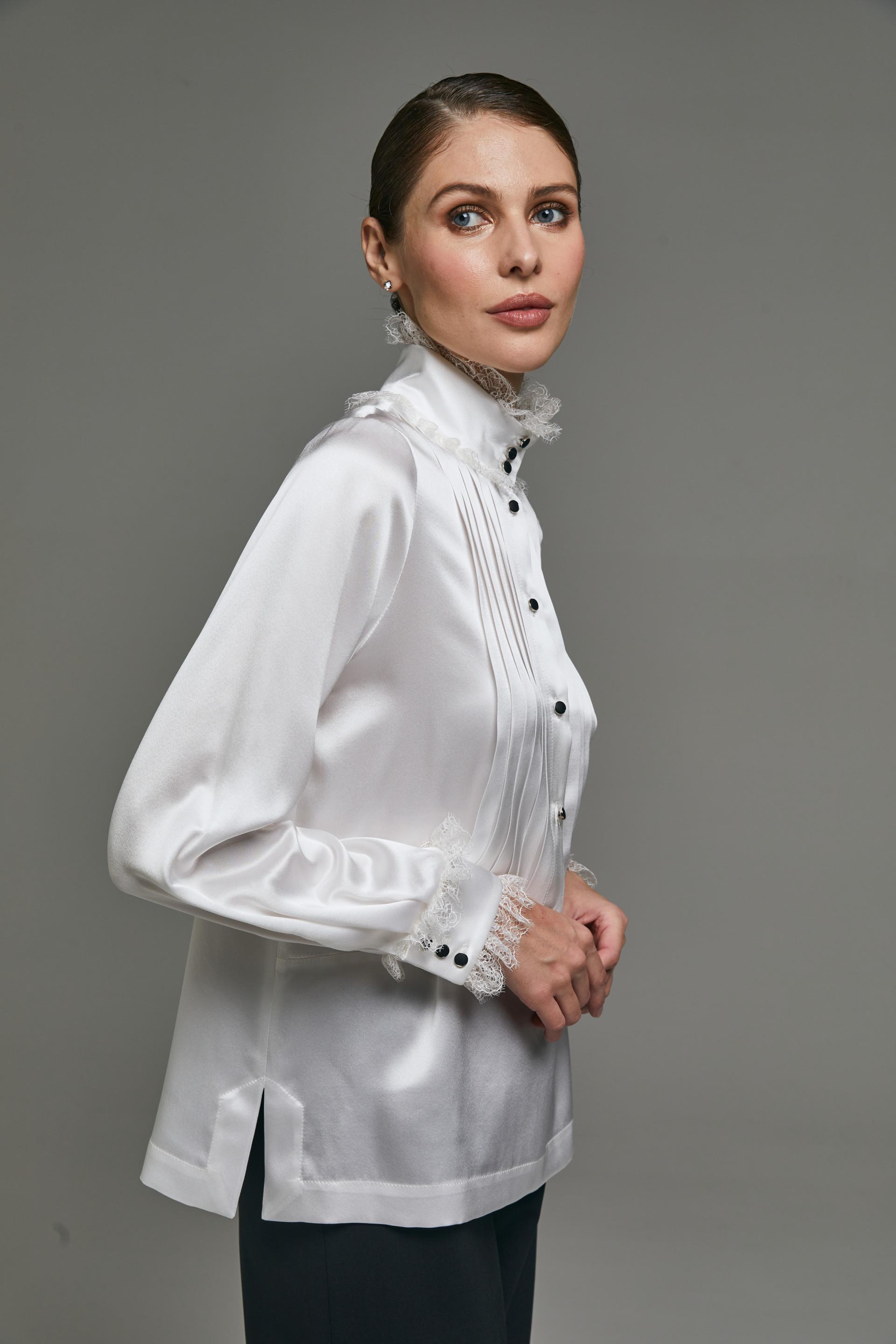 Если не знаете, какие модные блузки подходят для особых случаев, ответ здесь найдется. Отсылка к эпохе рококо читается в деталях: кружево, обрамляющее декольте, контрастные пуговицы по планке, вареный натуральный шелк, который мягко сияет и держит форму лучше, чем гладкий сатин.
