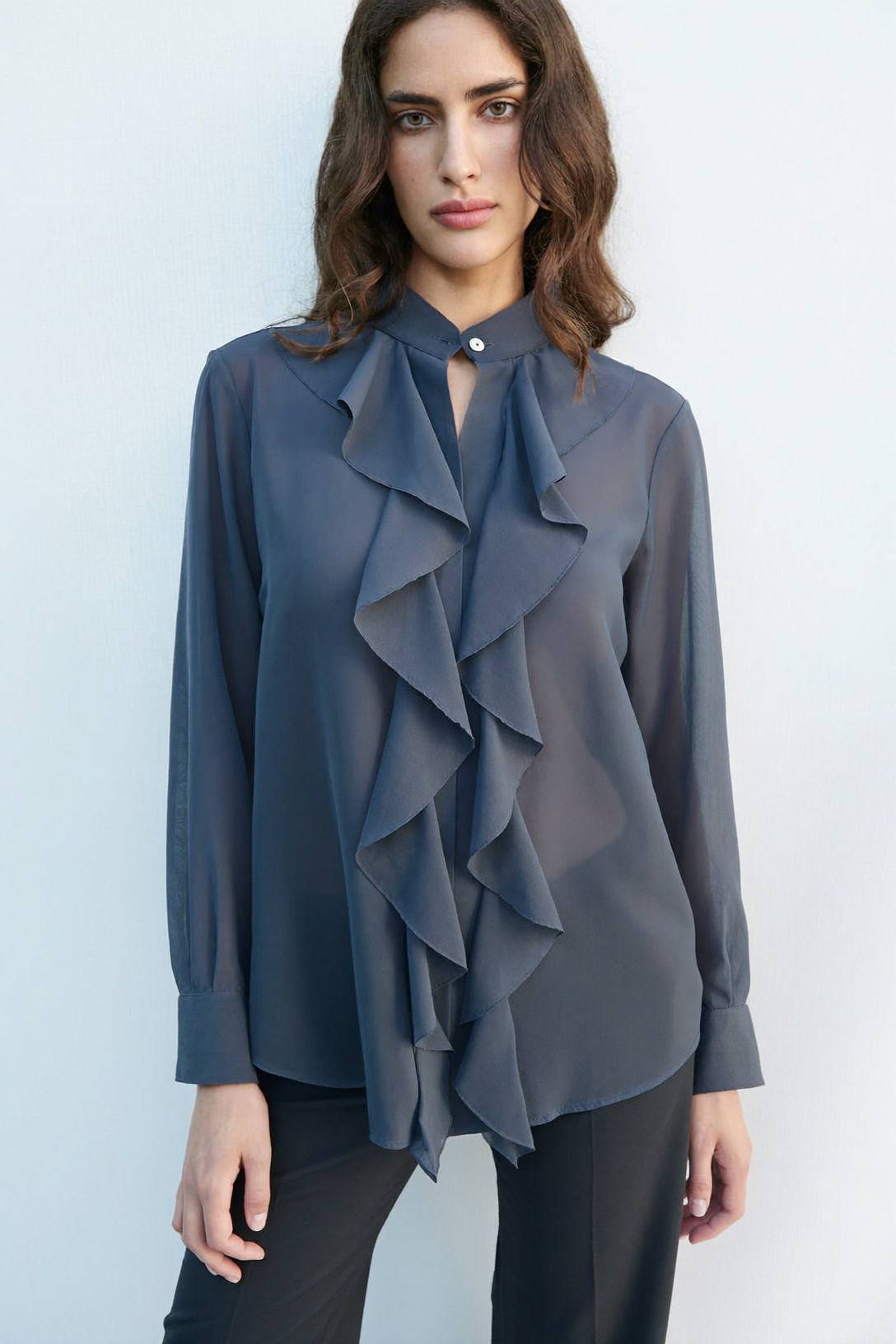 Модные блузки для женщин в 2026 году активно работают с фактурами, и органза здесь один из главных материалов сезона. Воздушная оборка по вороту-стойке мягко обрамляет лицо, не создавая лишнего объема. Органза держит форму, не мнется и дает тот «хрустящий» объем.