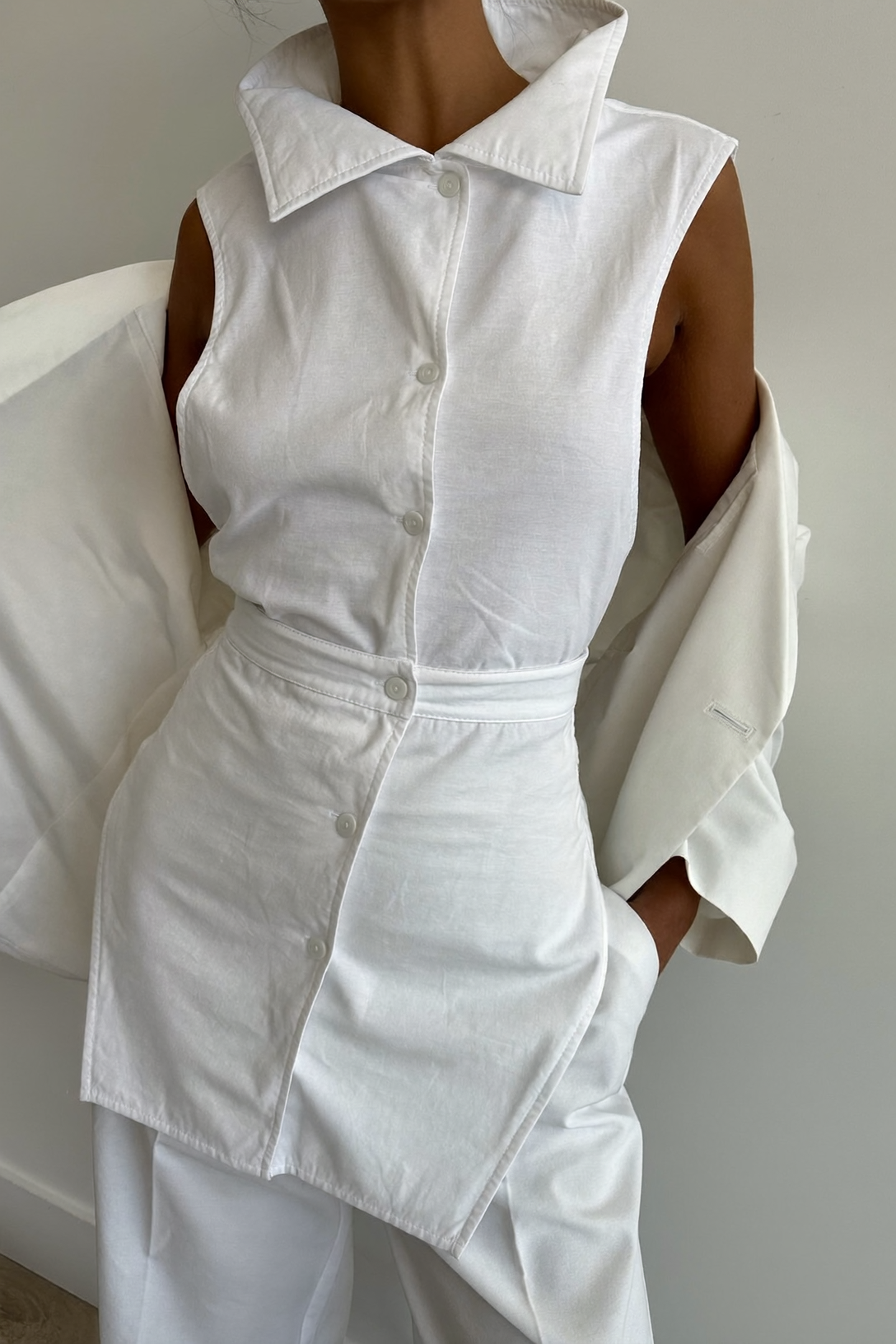 Модель из натурального хлопка решает конкретную задачу: утром — под жакет, и образ лаконичен, подходит для любых переговоров. Воротник создает нужную степень формальности, не требуя полноценной рубашки. Вечером пиджак снимается, и манишка превращается в самостоятельный топ с интересной геометрией.