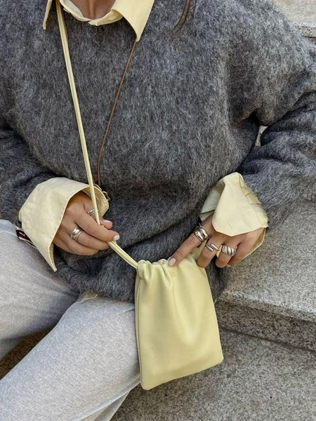 Кисет — один из лучших ответов на вопрос, какие сумки модные весной 2026 для повседневной жизни. Он легкий, не ограничивает движений и при этом выглядит актуально. Носить его можно нараспашку — кстати, один из главных трендов всего сезона: сумки намеренно не застегивают, показывая содержимое и подкладку как часть образа.