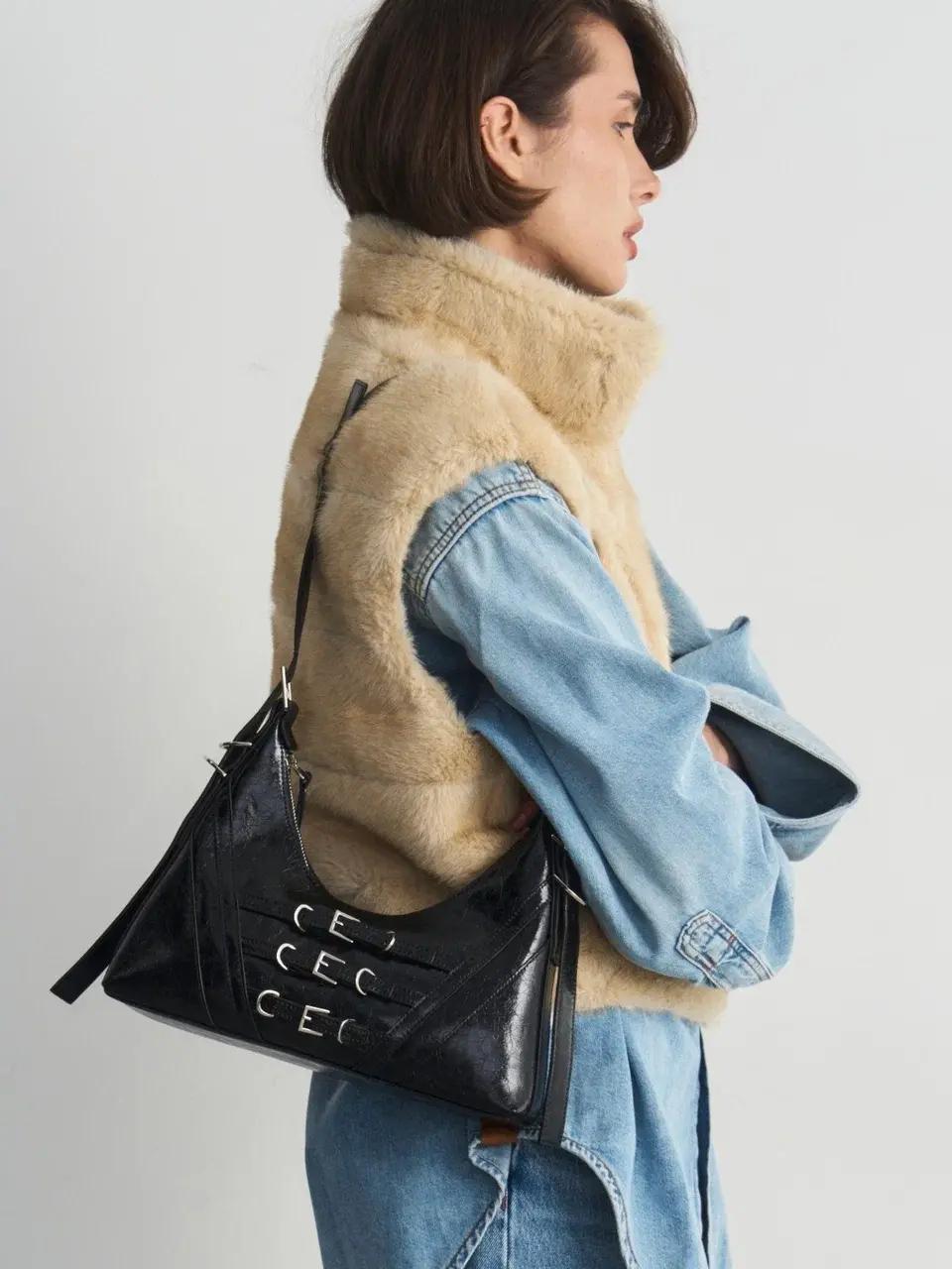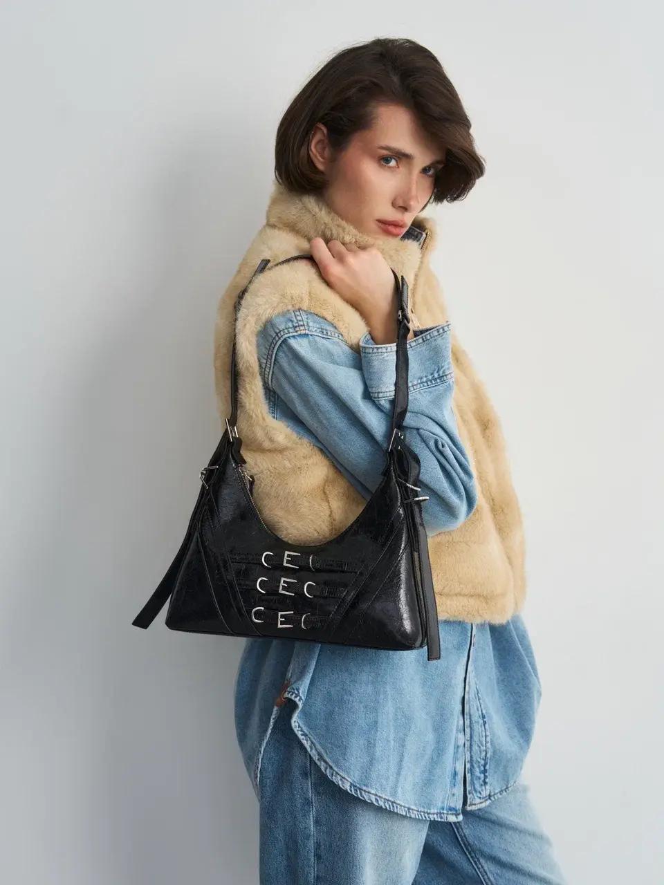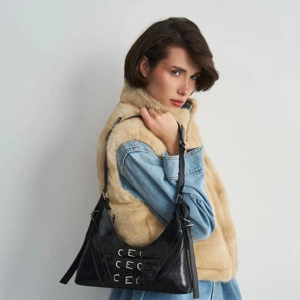 Аксессуар отсылает к эстетике ранних 2000-х — эпохе, когда сумка была не просто дополнением образа, а частью настроения. Лаковая поверхность с ультраблеском, мини-формат и форма baguette возвращают гламур Y2K, но в более актуальной интерпретации. Здесь мы видим дерзость, уверенность и визуальный акцент, который сразу притягивает взгляд.