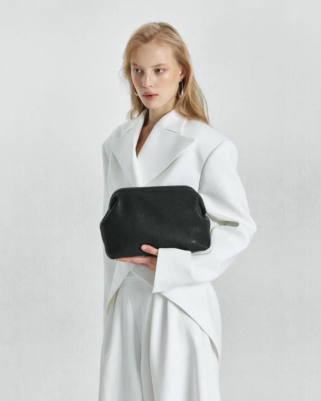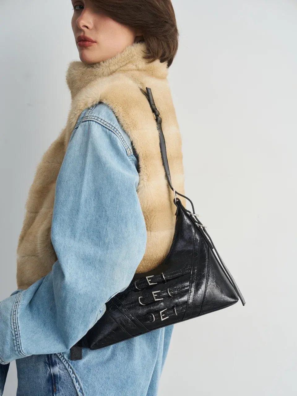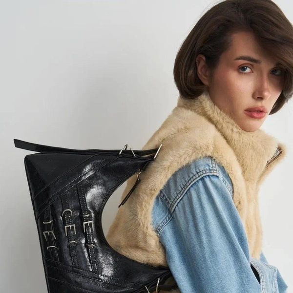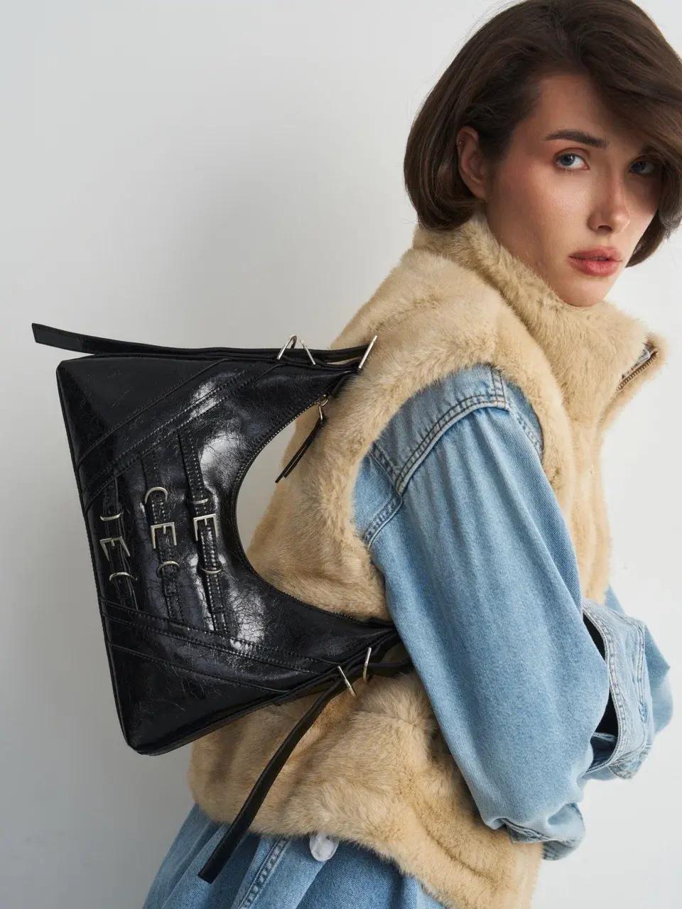 Аксессуар отсылает к эстетике ранних 2000-х — эпохе, когда сумка была не просто дополнением образа, а частью настроения. Лаковая поверхность с ультраблеском, мини-формат и форма baguette возвращают гламур Y2K, но в более актуальной интерпретации. Здесь мы видим дерзость, уверенность и визуальный акцент, который сразу притягивает взгляд.