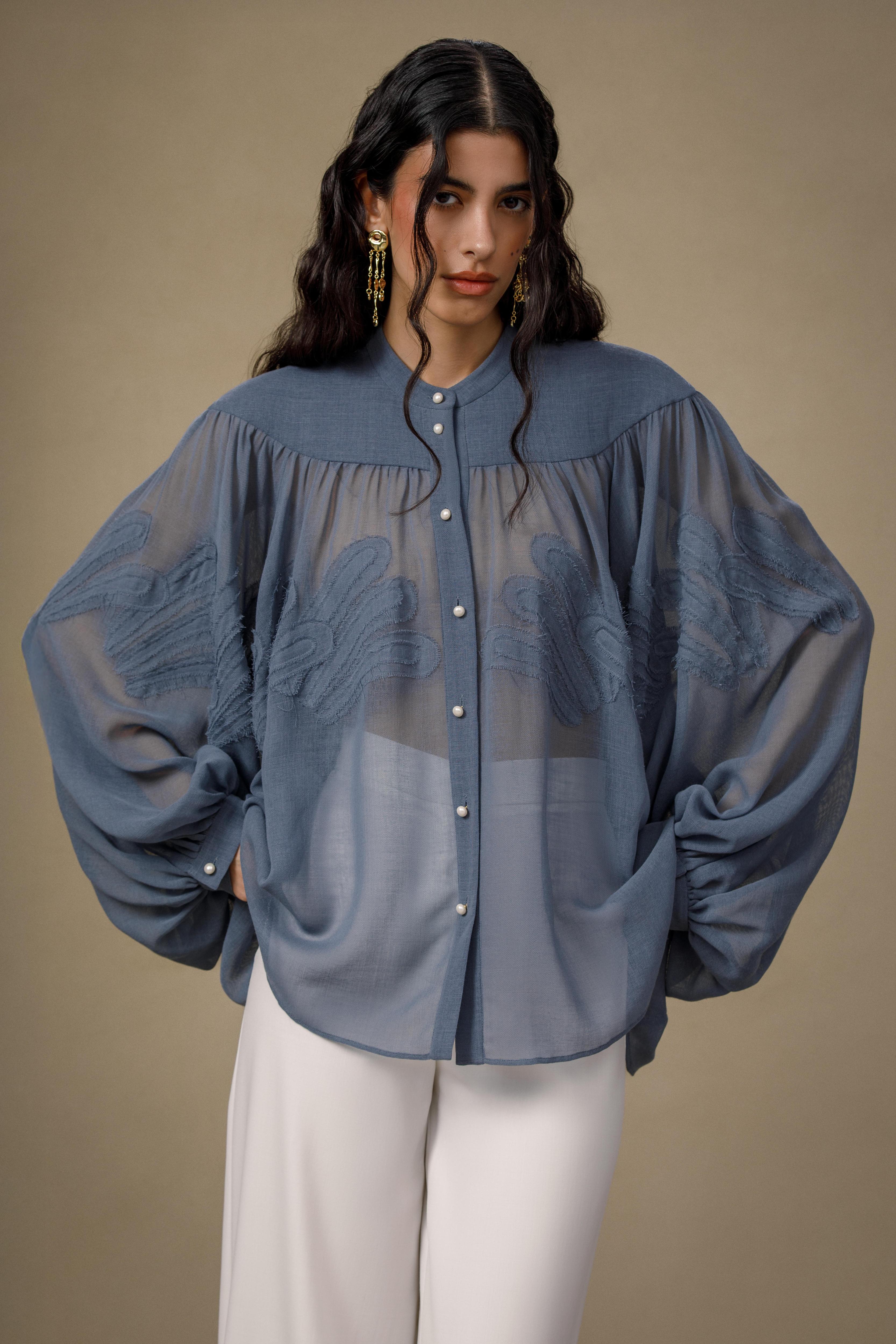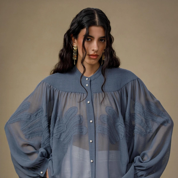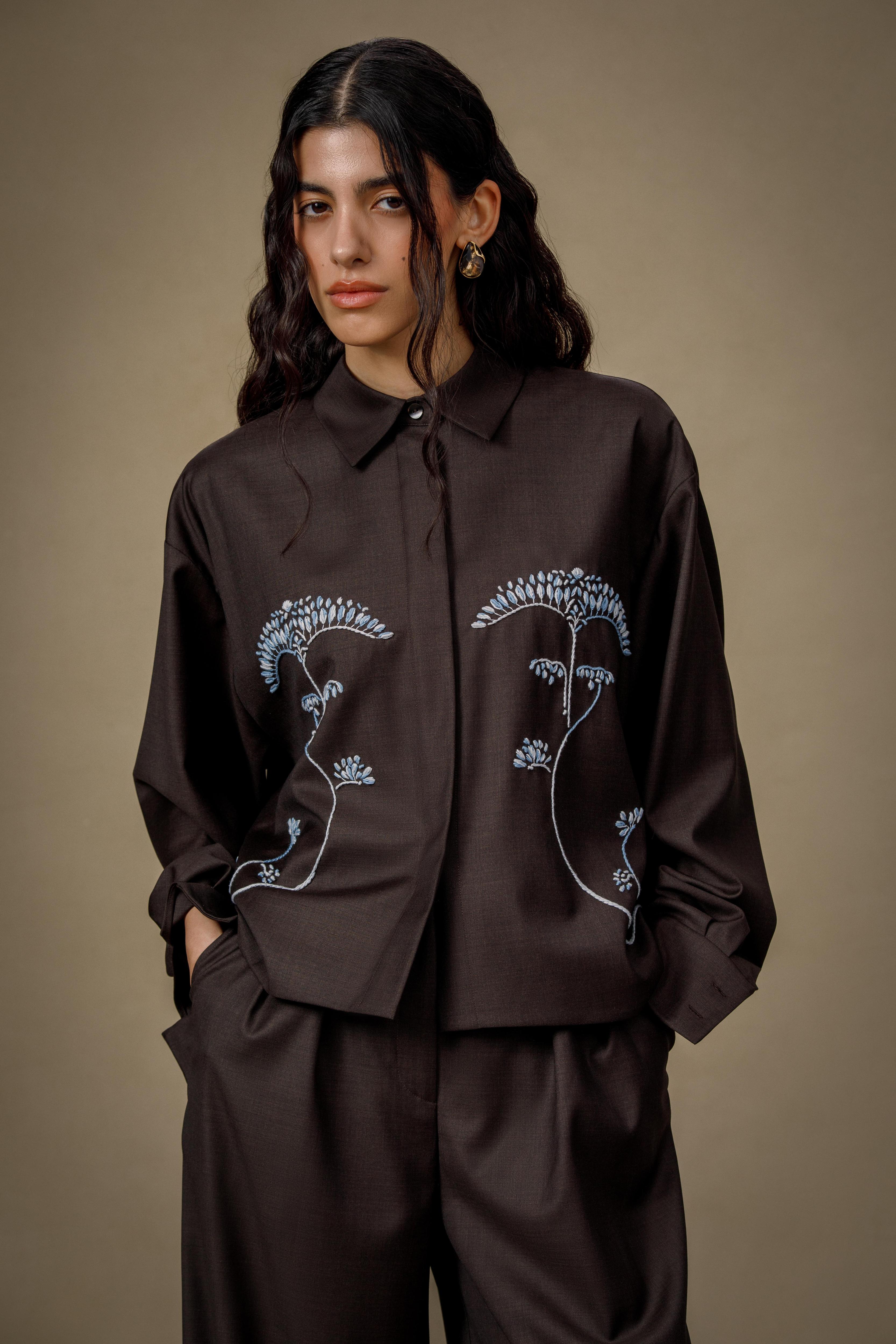 Вещи складываются в цельные образы за счет фактур и пластики: вышивка с растительными орнаментами, баски с кисточками из натуральных камней, топы с отсылками к символике лотоса. Объемные брюки из шерсти, миди-юбки и платья приглушенных оттенков поддерживают идею свободы и движения вне сезонных рамок.