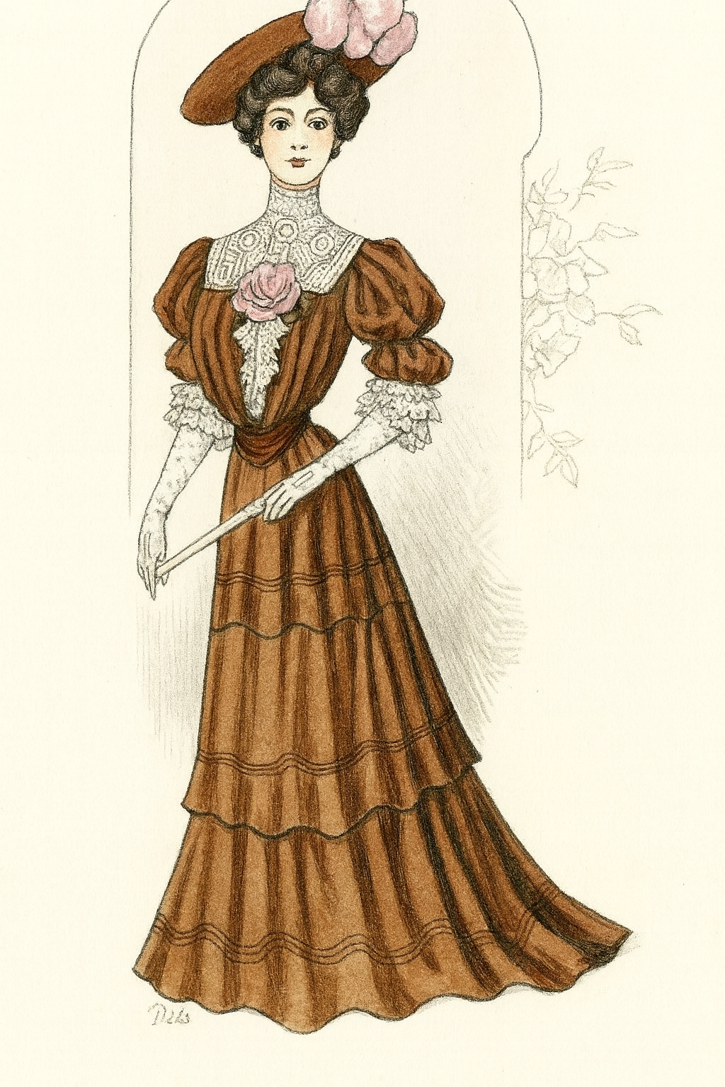 Главный тренд — S-образный силуэт, созданный с помощью жесткого корсета. Девушки стремились к эффекту высокого и пышного бюста, тонкой талии и широких бедер. Те, кого природа не наградила формами, шли на ухищрения и подкладывали подушечки в «стратегически» важные места. Монументальность конструкции «снижали» ткань и отделка — платья часто шились из легких материалов и украшались кружевами, вышивкой, лентами.
