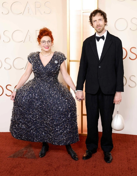 Художник по костюмам на красной дорожке «Оскара-2026» — всегда повод для особого внимания: человек, который одевает других, наконец наряжает и себя (читайте также: Вы удивитесь: как одеваются редакторы и модные критики в реальной жизни). Малгося Тужаньска выбрала темно-синее платье с пышной юбкой, буквально усыпанное тысячами английских булавок. Как высказывание понятно, а как наряд для главной кинопремии года — спорно.