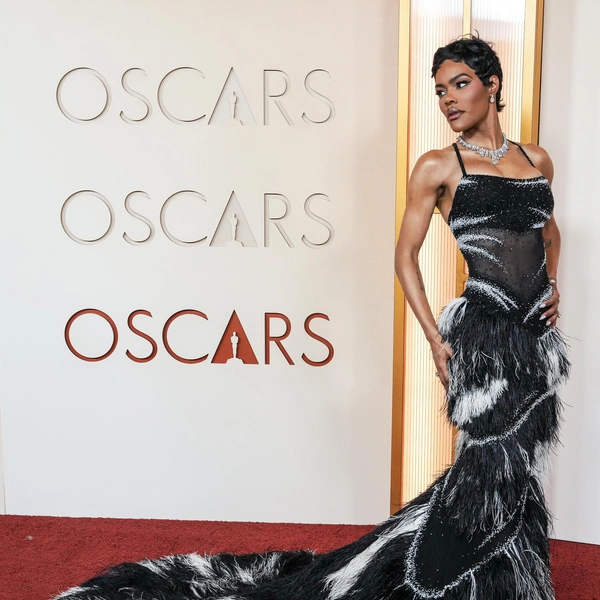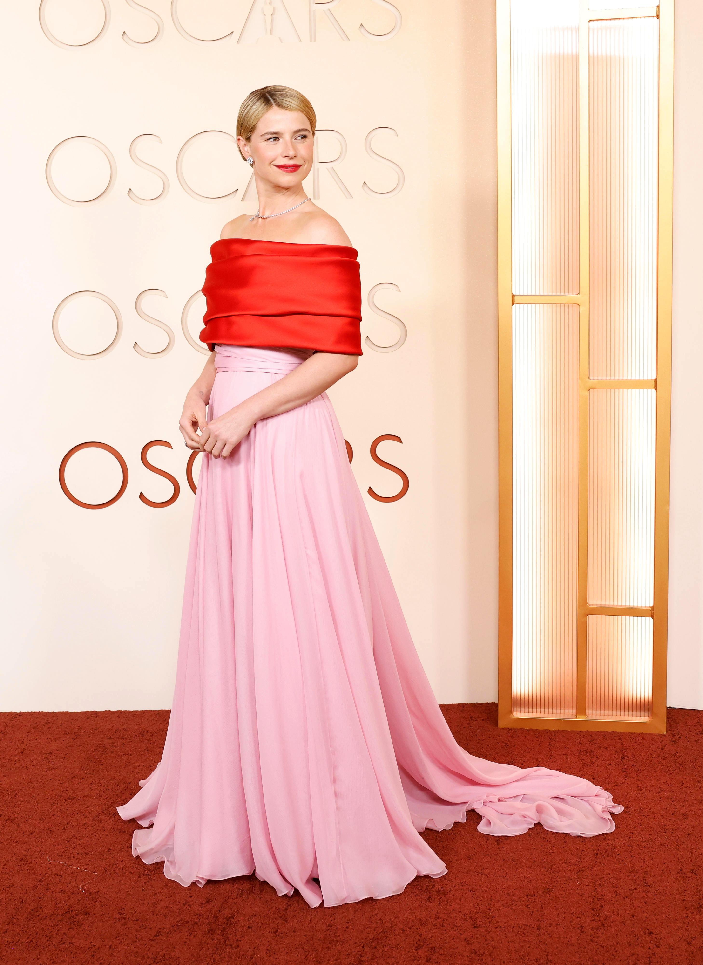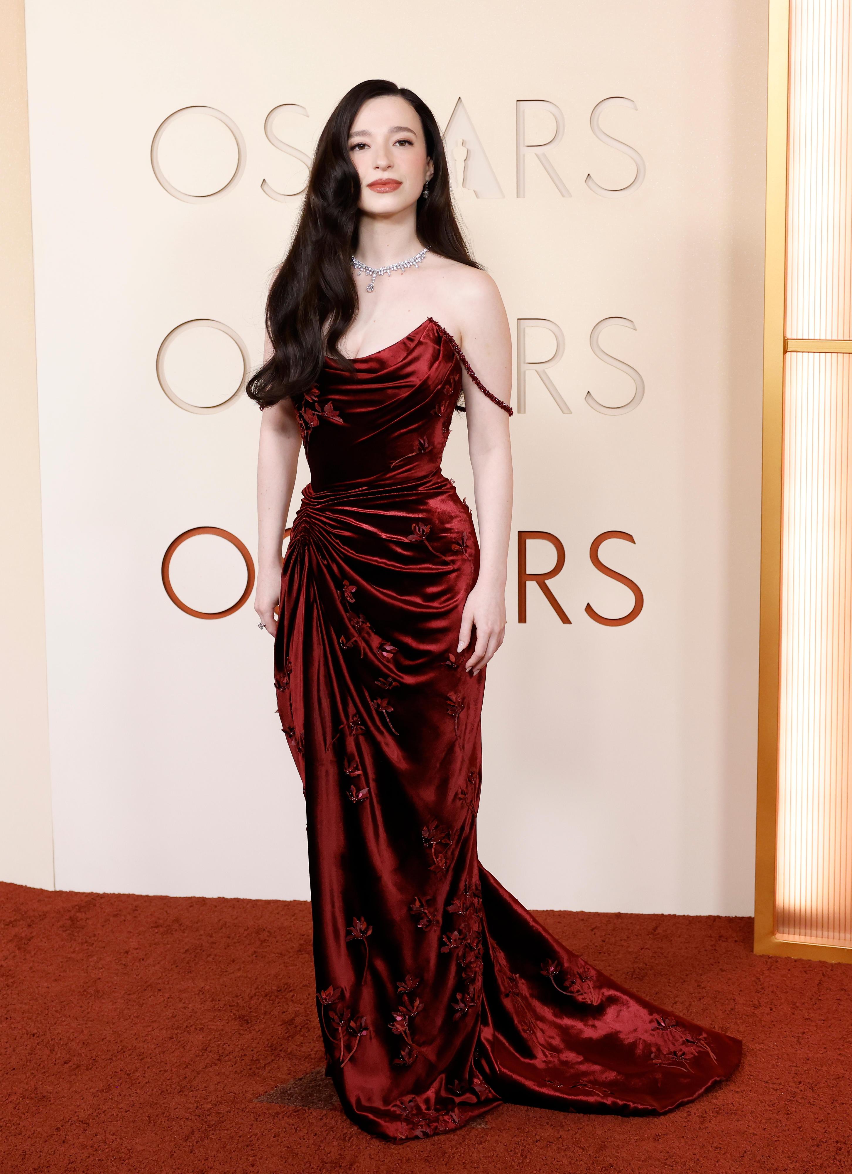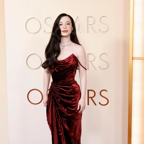 Платье с открытыми плечами и длинным шлейфом выстроено на контрасте: темный бархат и пышные цветы пудровых оттенков, строгий широкий пояс и черные перчатки выше локтя. Массивное бриллиантовое колье и серьги завершают образ, не перегружая его: украшения здесь работают как гармоничный финальный аккорд. Один из самых продуманных выходов церемонии «Оскар-2026» (и один из самых обсуждаемых).