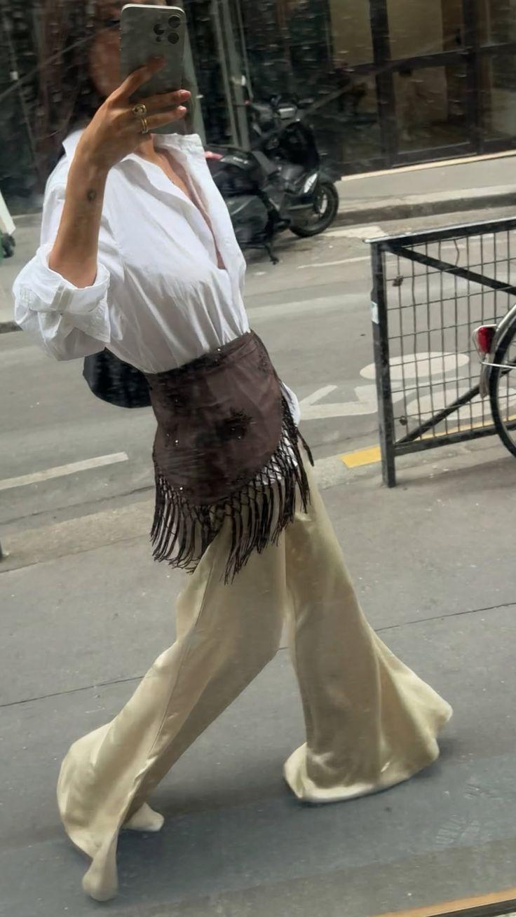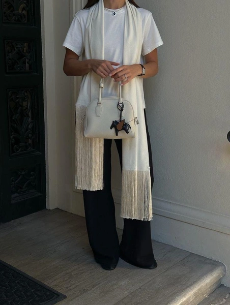 Вот где начинается настоящий стайлинг: тонкий шарф с длинной бахромой превращается в кушак — и это один из главных трюков сезона. Повяжите его поверх прямых брюк, широкой юбки или даже пальто — бахрома будет красиво свисать по бокам, создавая эффект движения.