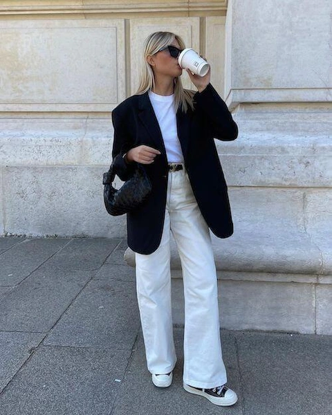 Главное их достоинство — универсальность. Белые джинсы вытягивают образ и придают ему элегантности даже тогда, когда верх максимально простой. Базовая рубашка, тонкий свитер или легкий блейзер — белый низ работает с любым из этих вариантов. Единственное правило сезона: никакой небрежности в сочетаниях, потому что белые джинсы требуют аккуратного верха.