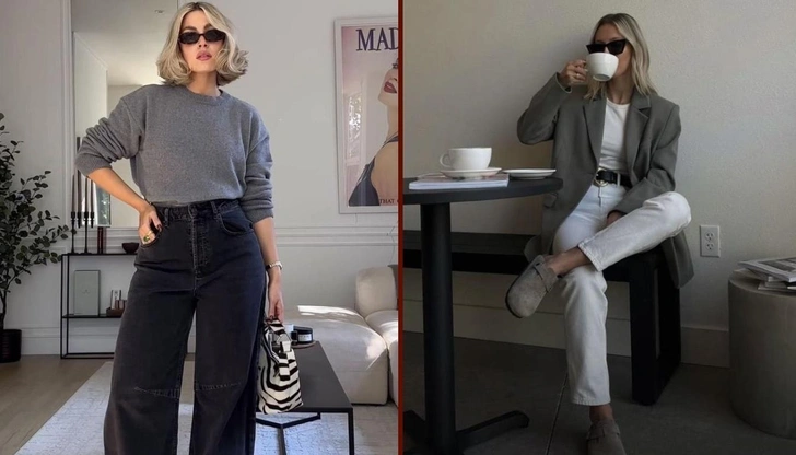 Светло-серые модели — идеальная пара к белой рубашке, льняному пиджаку или тренчу (читайте также: Француженки больше не носят бежевые тренчи: весной 2026 они выбирают эту вещь). Темно-серые джинсы работают иначе: в паре с черным верхом они дают образу нужную остроту и не требуют никаких дополнительных акцентов. Серый — редкий оттенок, который одинаково хорош и в офисном наряде, и в аутфие для свидания.