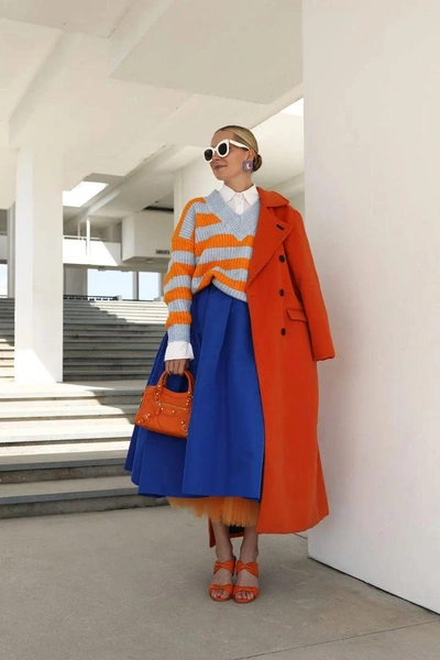 Как носить: начните с простого — например, сочетайте ярко-розовую блузу с голубыми брюками или оранжевую юбку с фиолетовым топом. Более смелый вариант — платье или костюм, в котором уже скомбинированы контрастные цвета. Важно, чтобы цвета были насыщенными и чистыми, без полутонов.