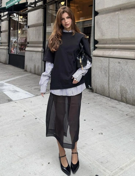 Как носить: надевайте прозрачную юбку поверх непрозрачной базовой, сочетайте прозрачный топ с платьем-комбинацией или носите платье-органзу поверх брюк. Многослойность позволяет играть с пропорциями и создавать объем без утяжеления силуэта. Для повседневных образов ограничьтесь 2-3 слоями, для вечерних можно больше.