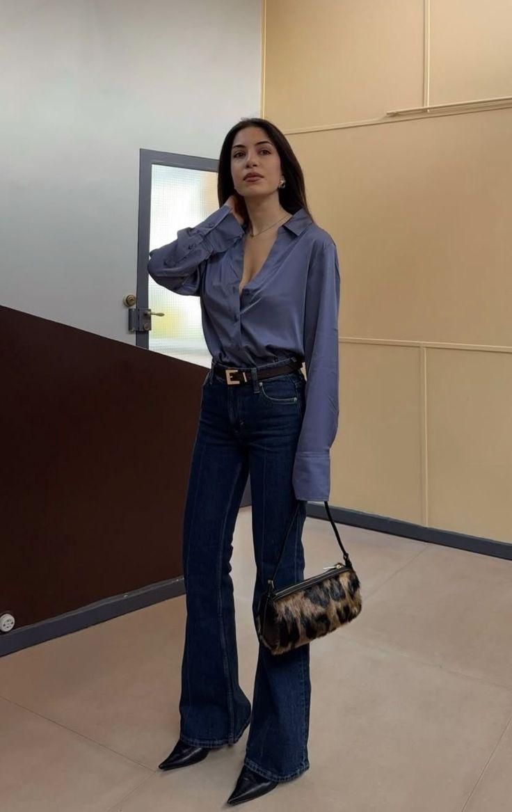 Модные джинсы сезона весна-лето 2026 в этом варианте хорошо работают с каблуком — он подчеркивает линию расклешения.