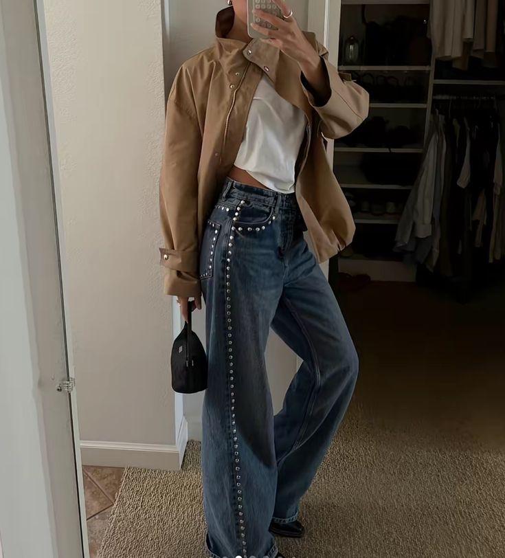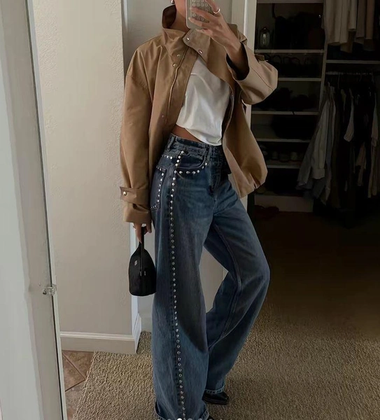 Тренды джинсов 2026 работают по одному правилу: чем ярче джинсы, тем спокойнее должен быть верх. Однотонный топ или нейтральный свитер, и украшенные джинсы сразу выходят на первый план.