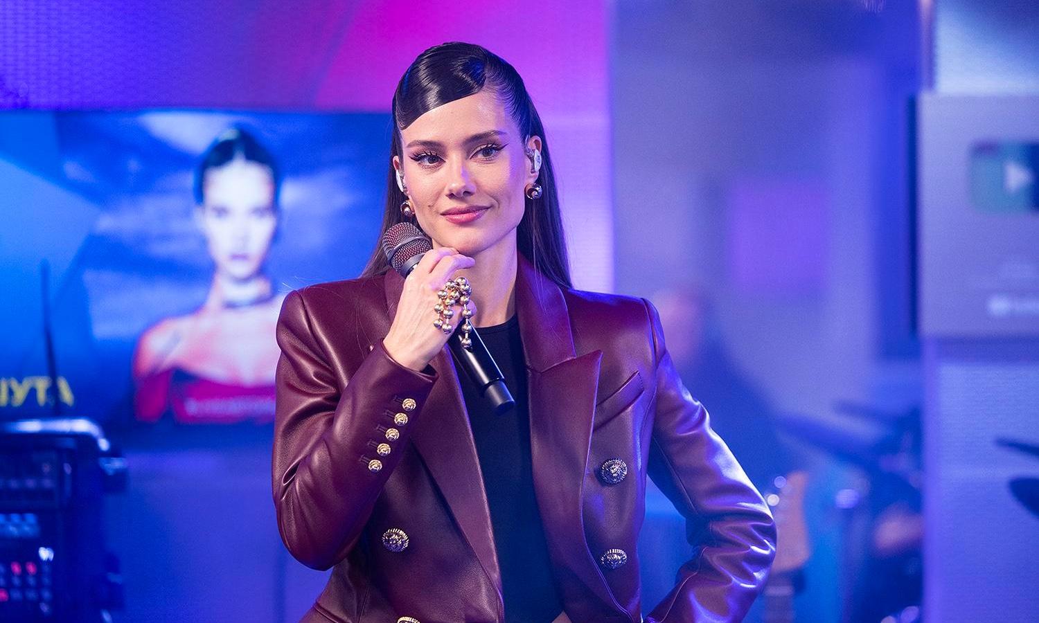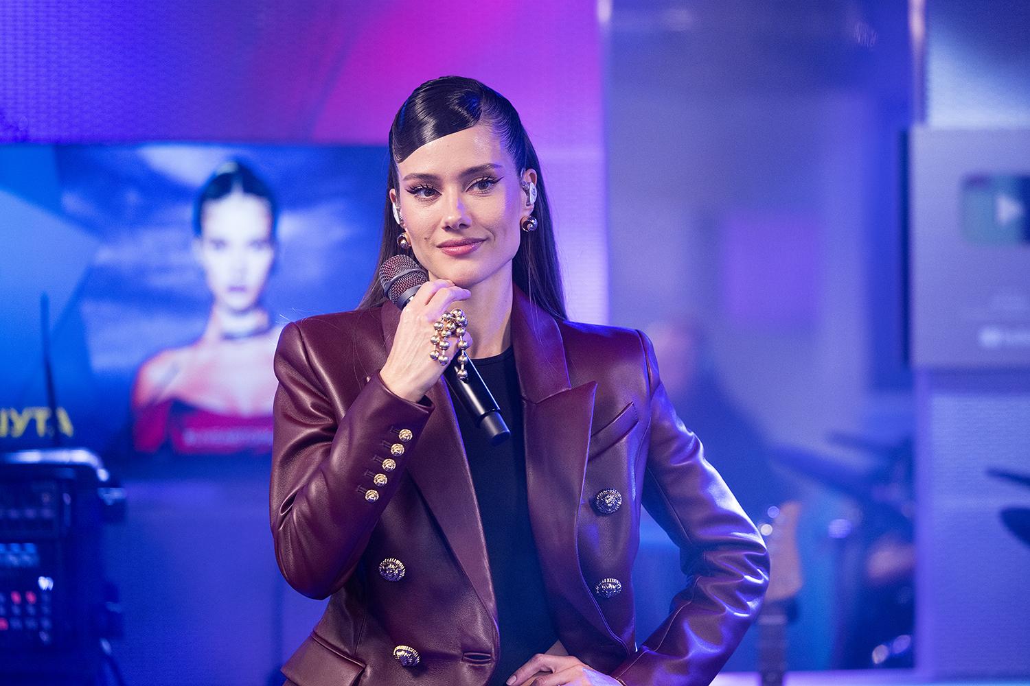 В студию «Мурзилок Live» Юля Паршута вошла так, как выходит на сцену — собранно, ярко и с характером. Кожаный жакет трендового оттенка бордо стал не просто деталью гардероба, а настоящим стержнем образа. Приталенный силуэт с четкими плечами и двубортный крой с золотыми пуговицами отсылают к эпохе гламура, но в прочтении Паршуты это звучит современно: стильно, уверенно и немного дерзко.